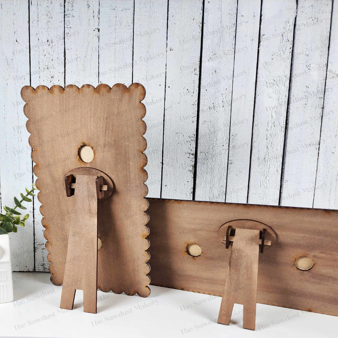 This can be cut on either 3mm (1/8")" or 5mm material. Easel slots may need to be adjusted in your own graphic software depending on the 1/4" type of material you are using.